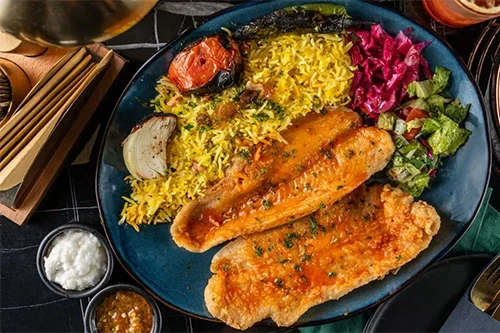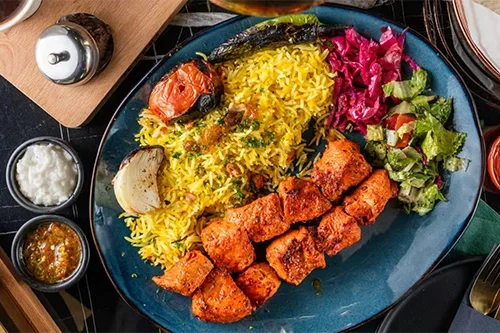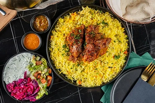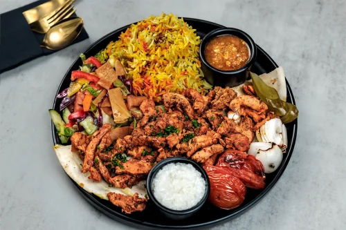 $25The famous Arabic dish comes with a big piece of Lamb served with spiced aromatic rice, Salad, Hot Sauce & Cucumber Salad.